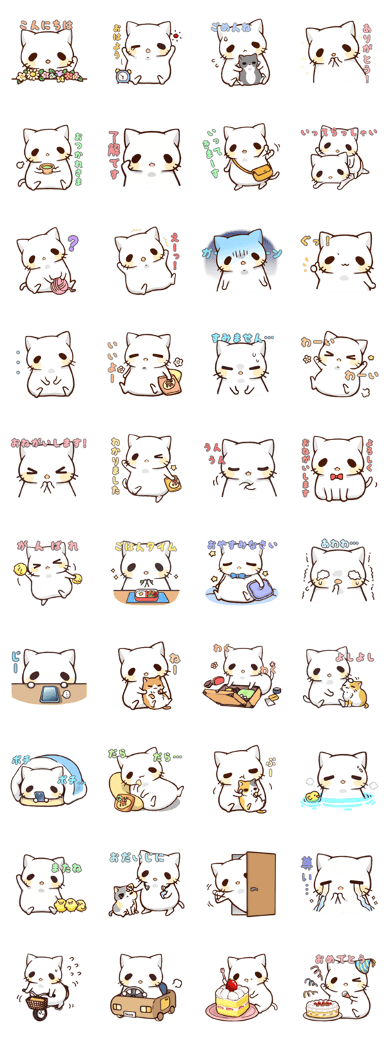 | スタンプ説明 | 発売中の「もちっと白ねこ」シリーズから、毎日使えるスタンプが新登場♪誰でも使える基本的な言葉をつめこみました♪スタンプ初心者の方でも使いやすいセットです♪ |