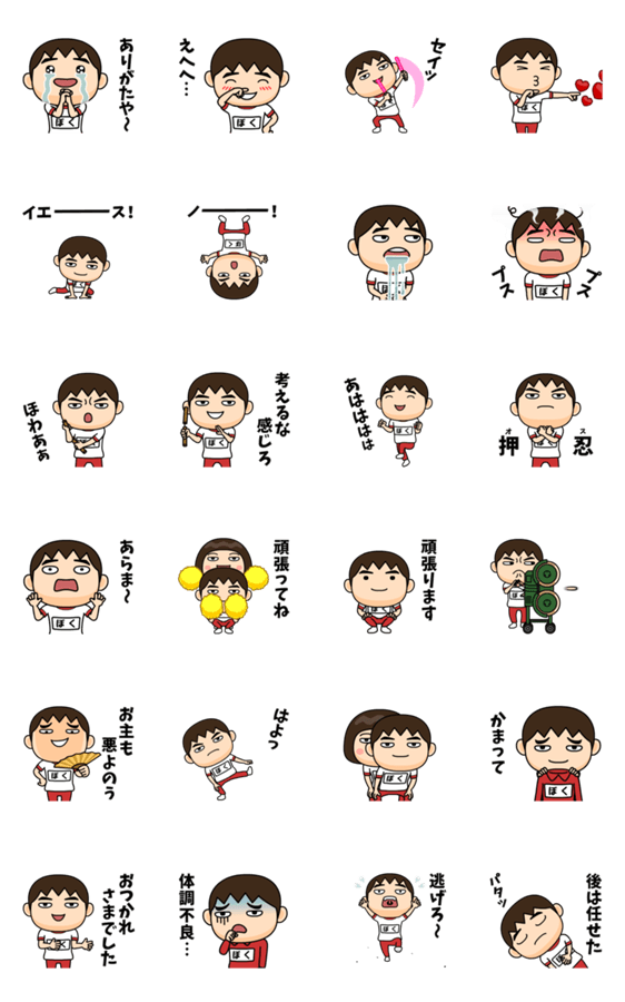 ぼく(ボク)が使う芋ジャージ男子の名前スタンプ第8弾!上着を脱ぎ捨て、ブレイクダンスやカンフーのヌンチャクなど、アクロバティックな動きを披露します!