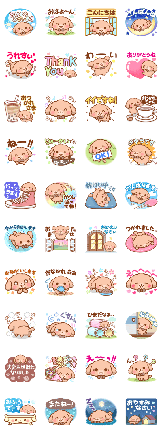 トイプードルちゃんのスタンプです。日常生活でよく使う言葉や挨拶を集めました。