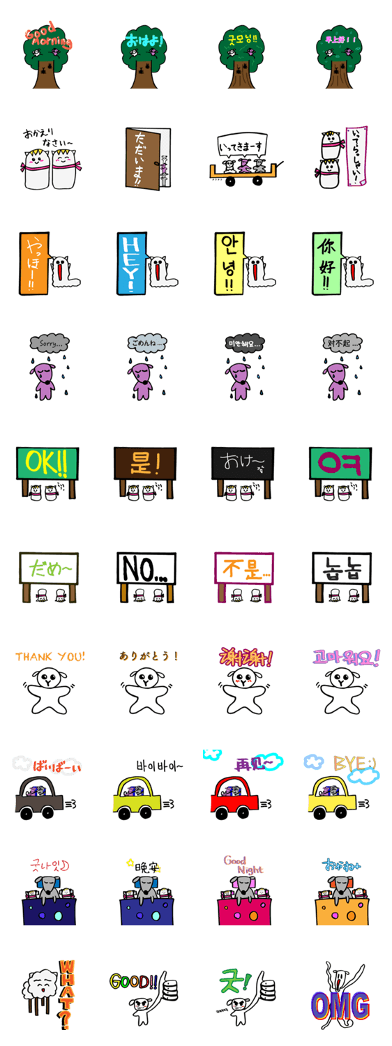 羊の五月美(めいみ)とその仲間たちの日本語、中国語、韓国語、英語がある日常生活で使いやすいスタンプです。