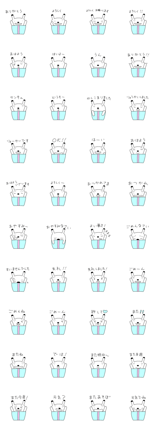 うさぎのサプラビがびっくり箱から飛び出して驚かせながら、ごあいさつをするスタンプです。ちなみにうさぎのサプラビは驚かすのがへたっぴです