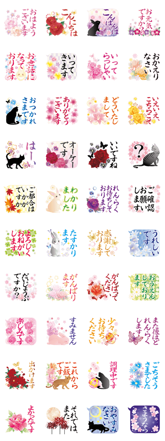 大きな文字で見やすい、美しい大人の和柄模様のスタンプ。和兎や黒猫、花々がトークルームを彩ります。