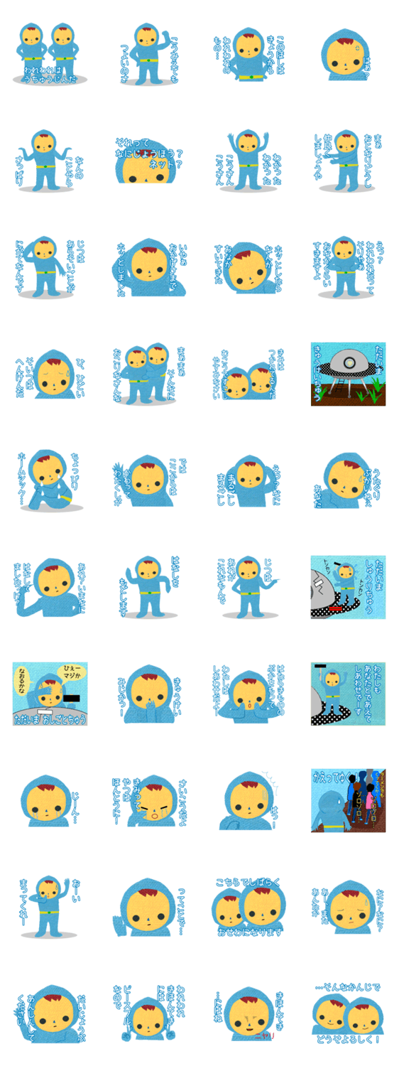小さくてかわいらしい、幼い子供のような宇宙人2人組のスタンプです。彼らが醸し出す「ぬるま湯」のような空気感に、ぜひ一度触れてみてください!
