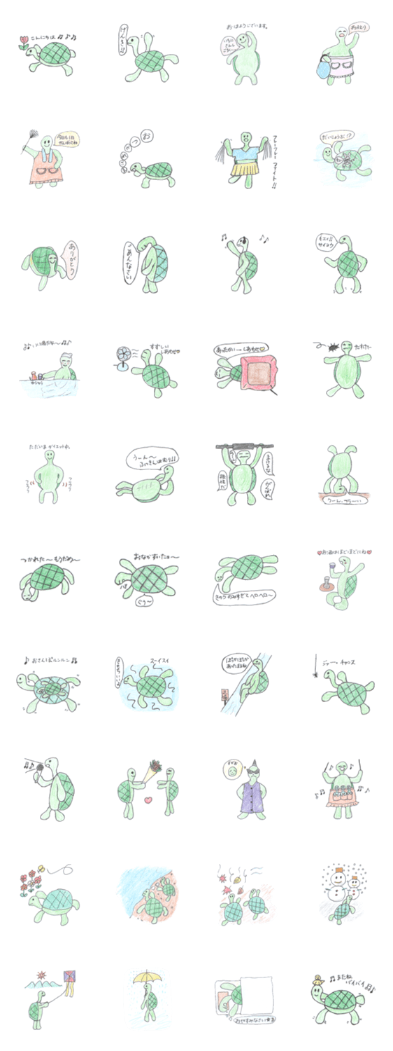 ガラケーを使っていて、スマホもLINEもよく知らない母の作ったスタンプです。何とも言えないゆるゆる具合が私にはツボです。『愉快なかめたちを可愛がって下さい。母』