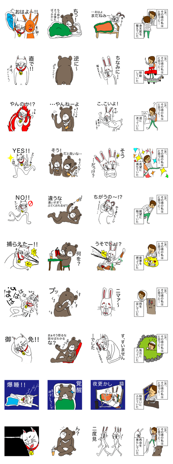 性格別の猫、熊、うさぎを描きました。人もいます。猫は直球、熊はひねくれ、うさぎはヘタレで三者三様ならぬ三匹三様。一方、その頃人(私)が何やら...