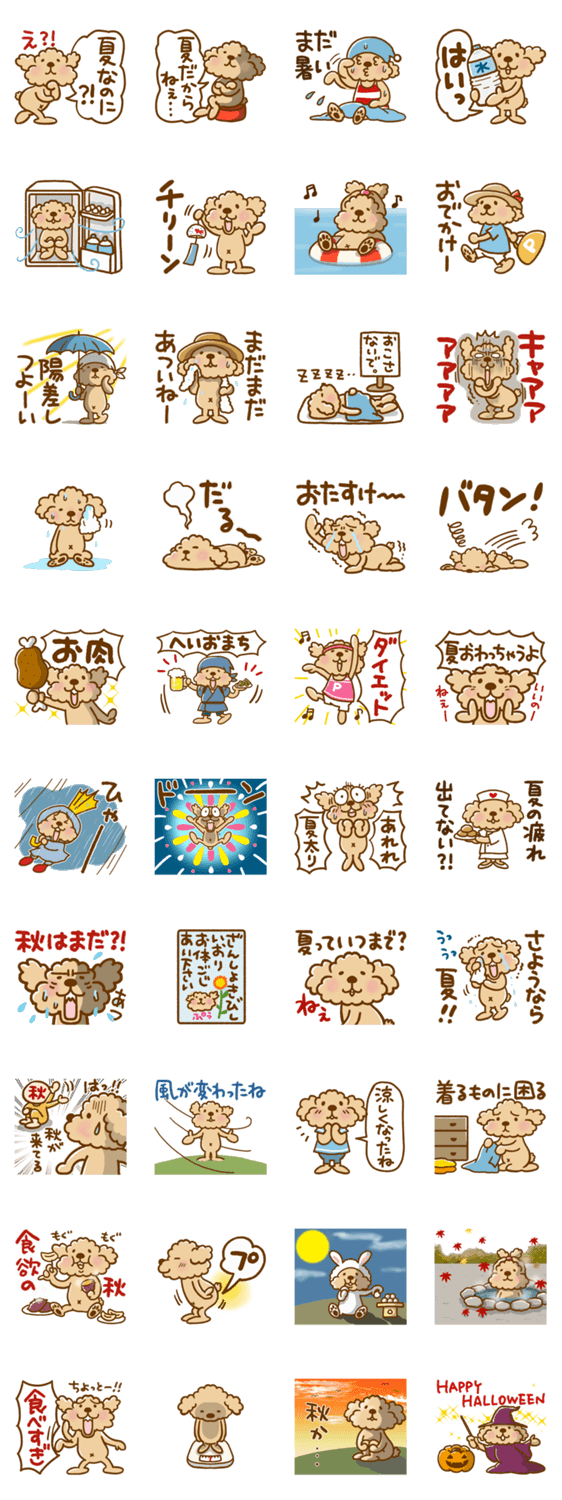 限りなく人間に近いリアクション犬、トイプードルのぷう太郎の夏から秋にかけて使える季節のスタンプです。