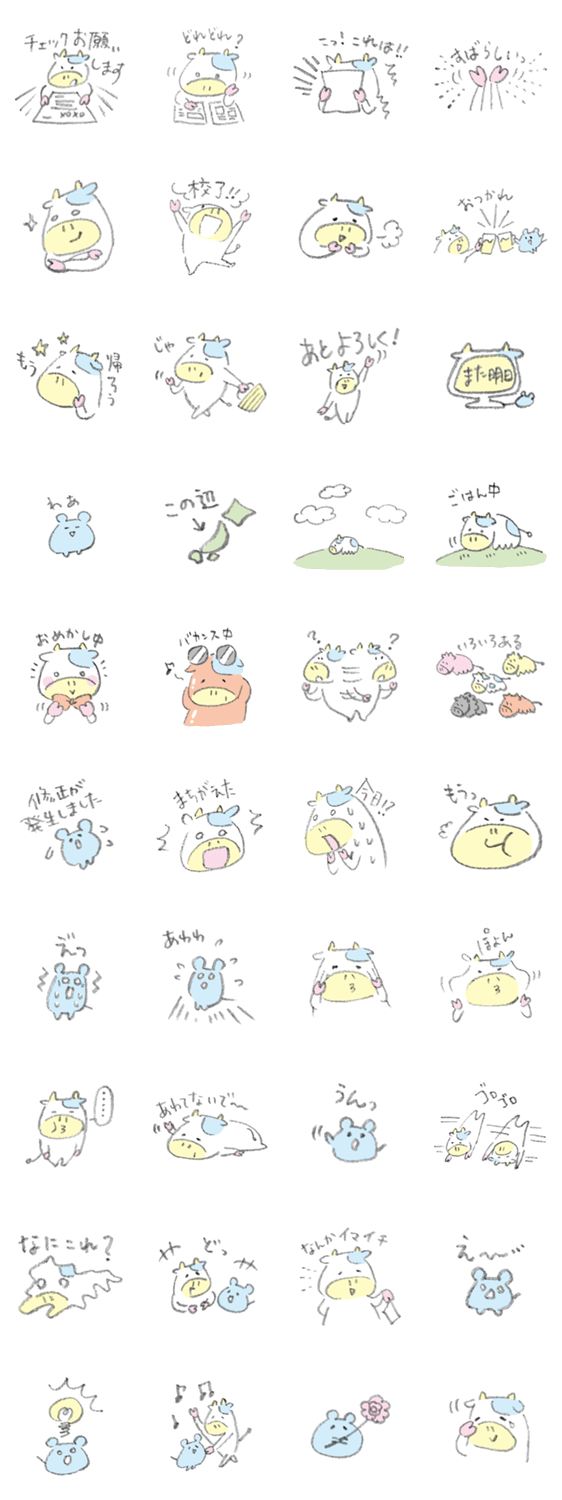 全国のウッシー、牛好き、牛と生きるあなたのために。ハートの手を持つウシさんとネズミさんのスタンプ。仕事のON・OFF切り替えます。