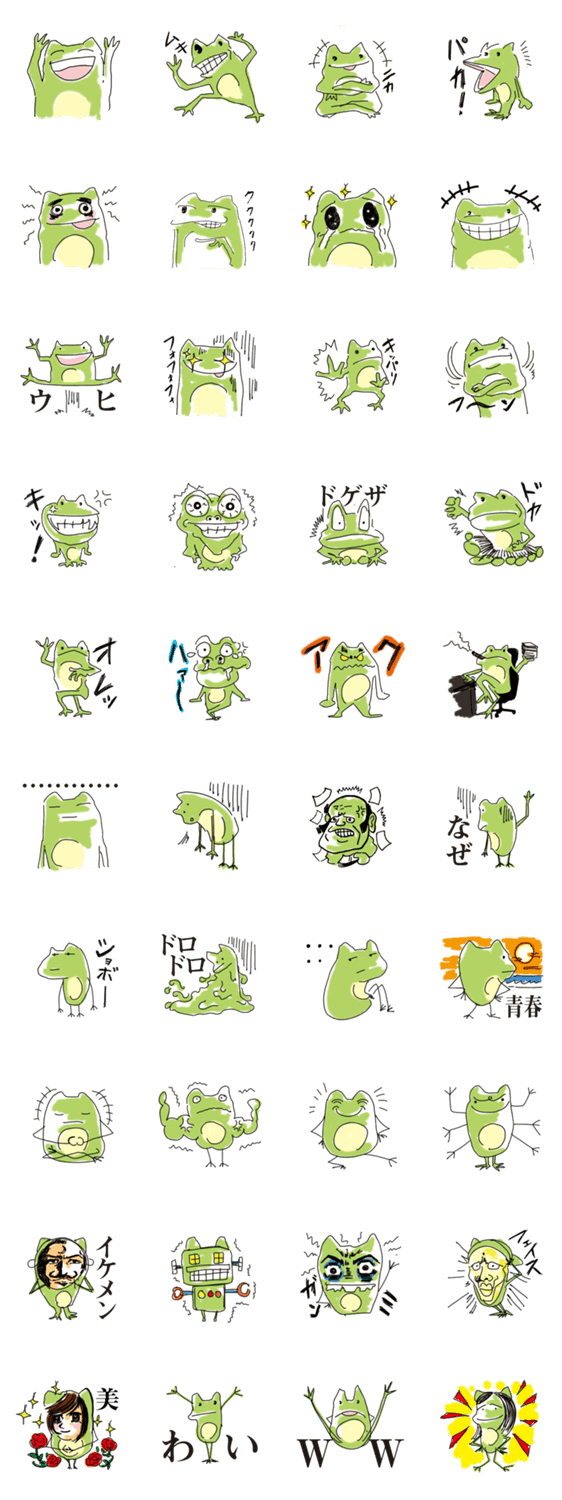 かわいいカエルの「かえさる」の喜怒哀楽の様々な表情が使えます。