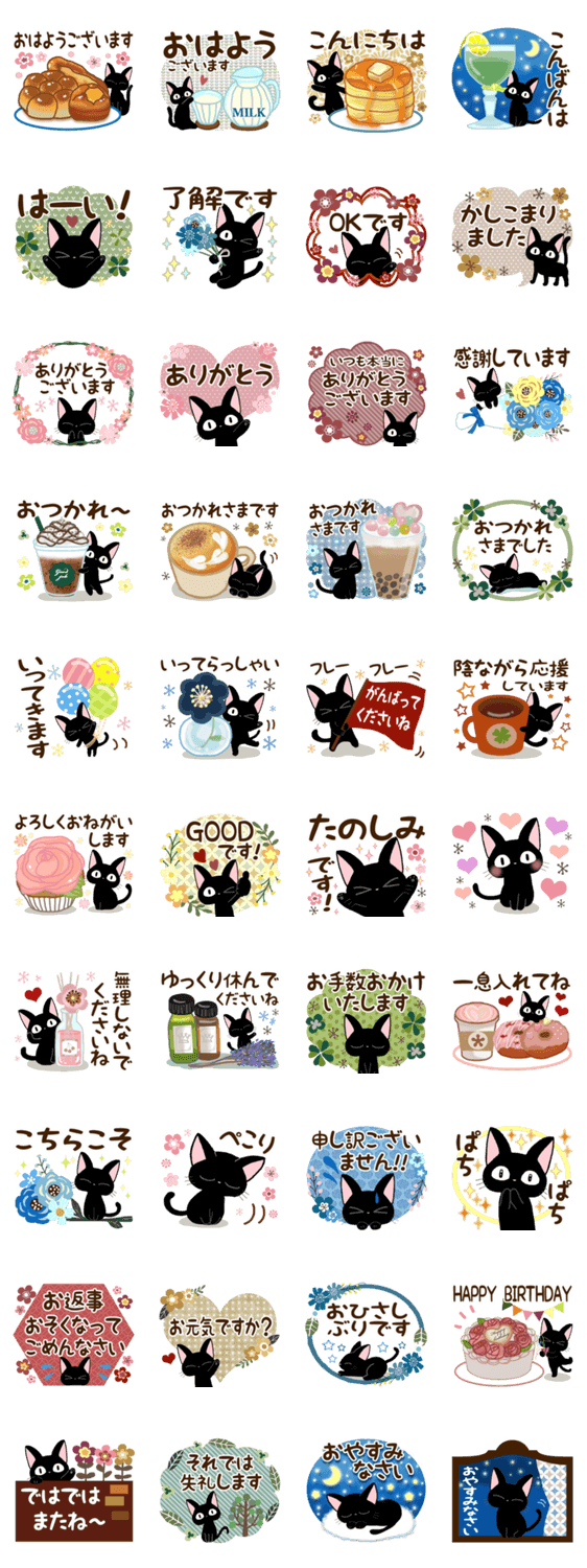 かわいい黒猫の、落ちついた色合いの日常スタンプです♪気づかいのある丁寧な言葉がいっぱいなので、送る相手を選ばず使えます❤️ 「ほのぼのカノジョ」ルルー作