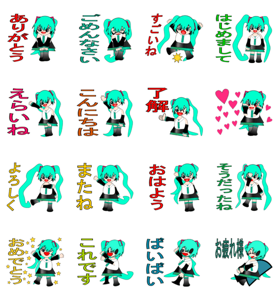 | スタンプ説明 | 小さくデフォルメした初音ミクのスタンプです。 基本的な挨拶中心にしているので使いやすいです。 |