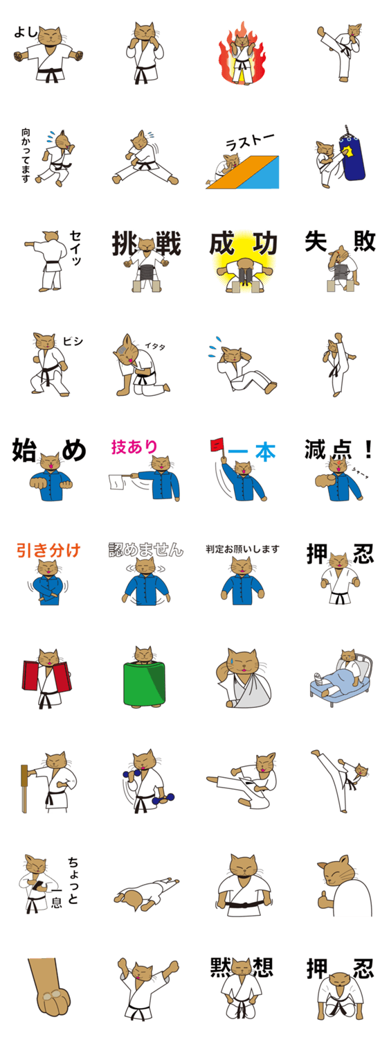空手の練習に明け暮れるネコ「ゴン」の日常を描いたスタンプです。礼にはじまり、サンチン立ち、試し割り、審判もやりますその他日常で使えるスタンプが盛りだくさんです