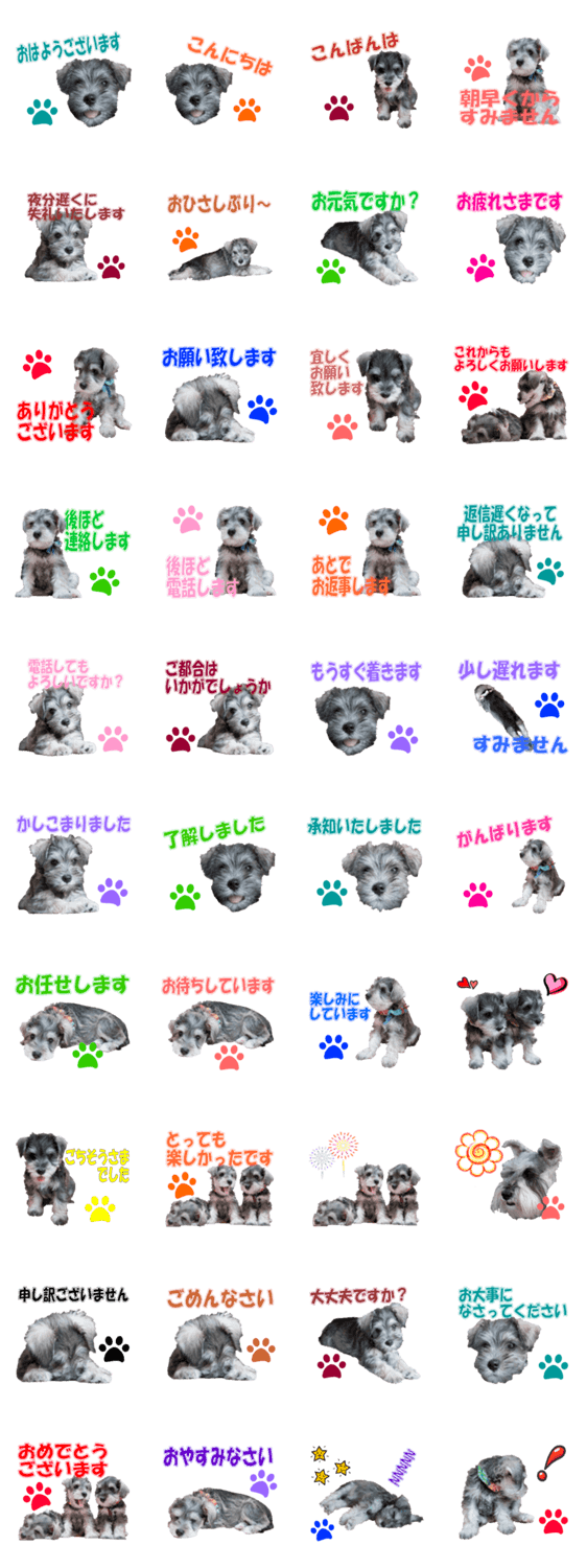 | スタンプ説明 | シュナウザーの写真と日常使える敬語をシンプルに入れています。 |
