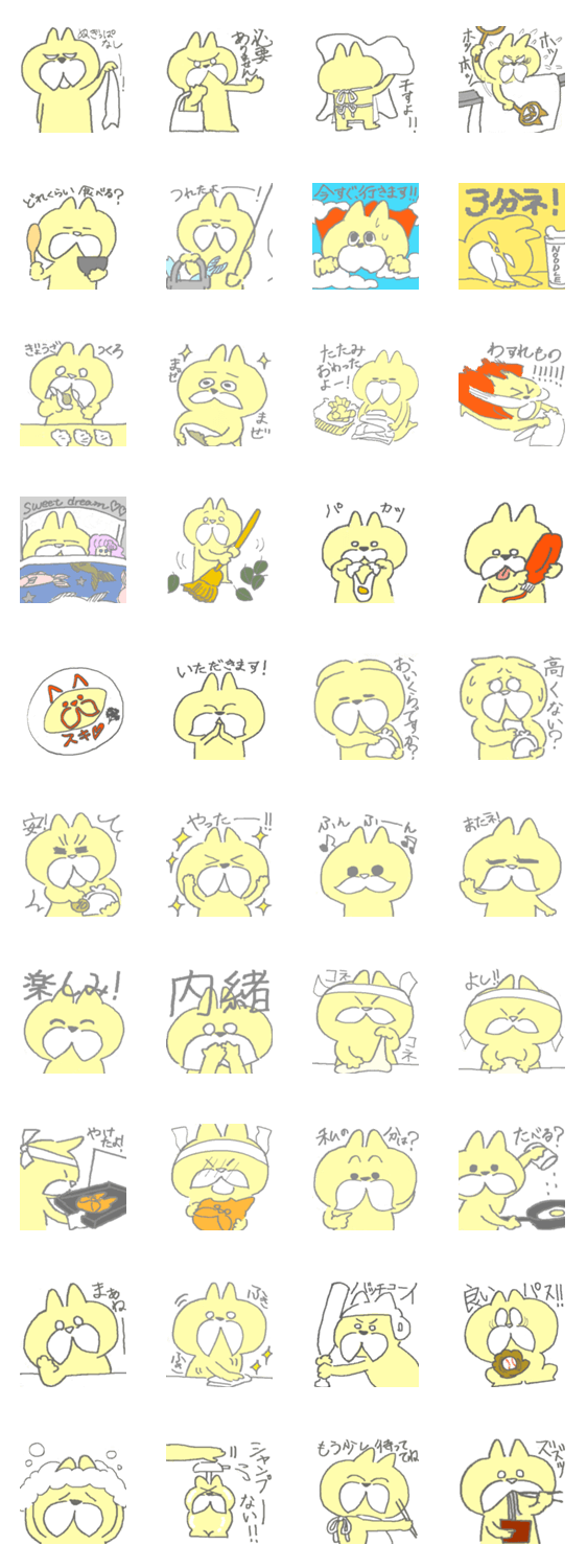 | スタンプ説明 | ゆるーくゆるーくおひげのねこちゃんの日常のちょっとした行動編です!ごはん食べたり、つくったり、お金払ったり、お掃除したり、お布団干したりしてます。 |