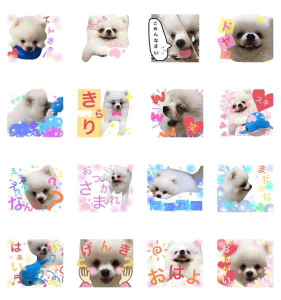 ポメラニアンホワイトの女の子めいちゃんのスタンプです。使い勝手のいい日常スタンプをつくりました。