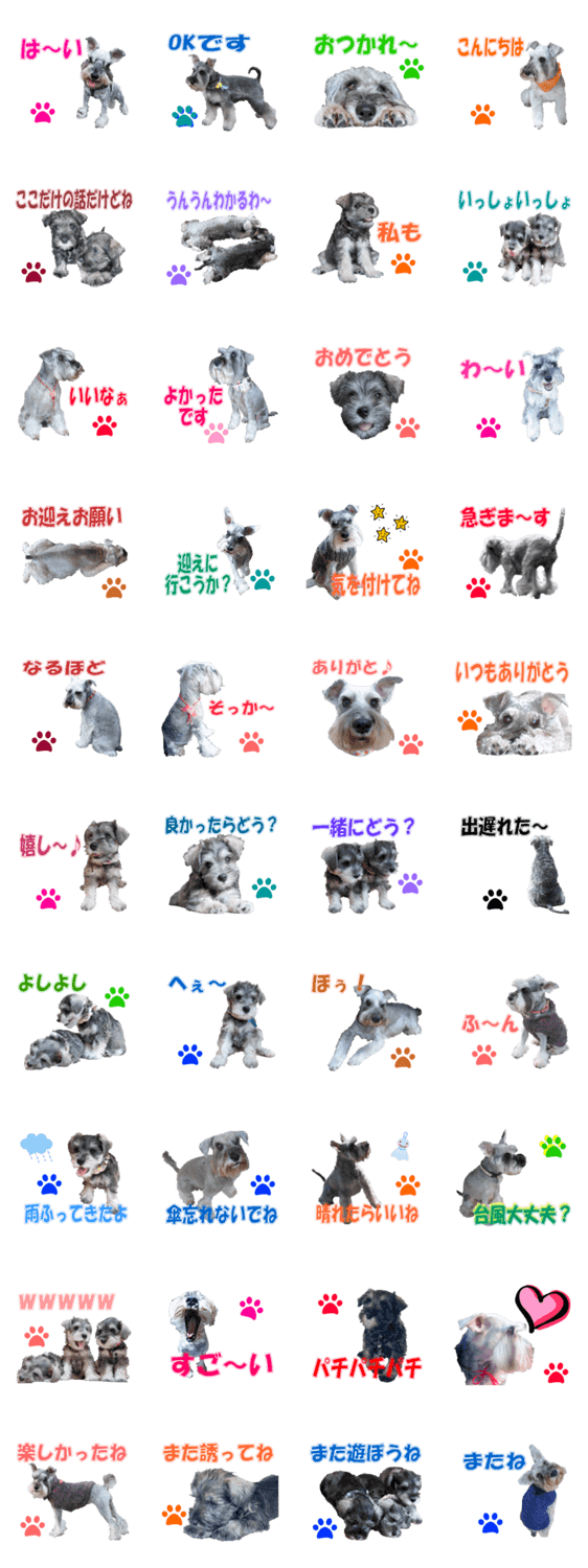 | スタンプ説明 | シュナウザーの写真とお友達との日常会話をシンプルに入れています。 |