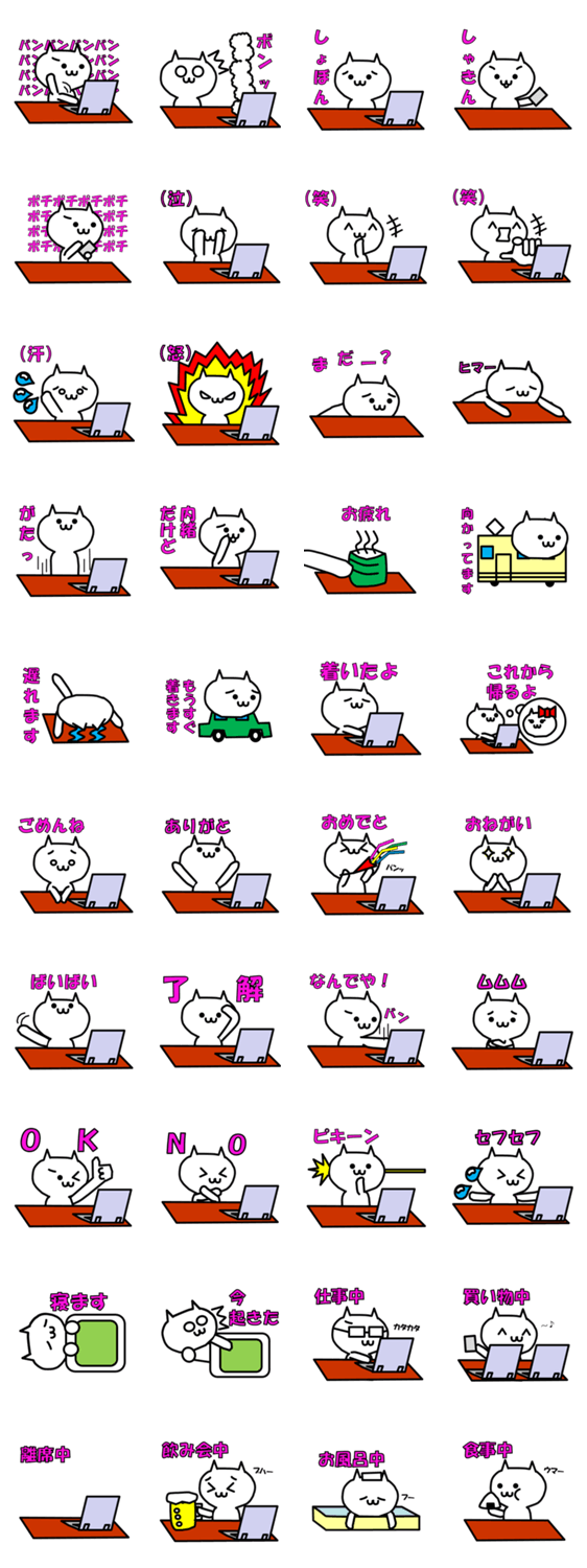 PCに向かうインドアなネコのスタンプです!日常でよく使う言葉も入っています。