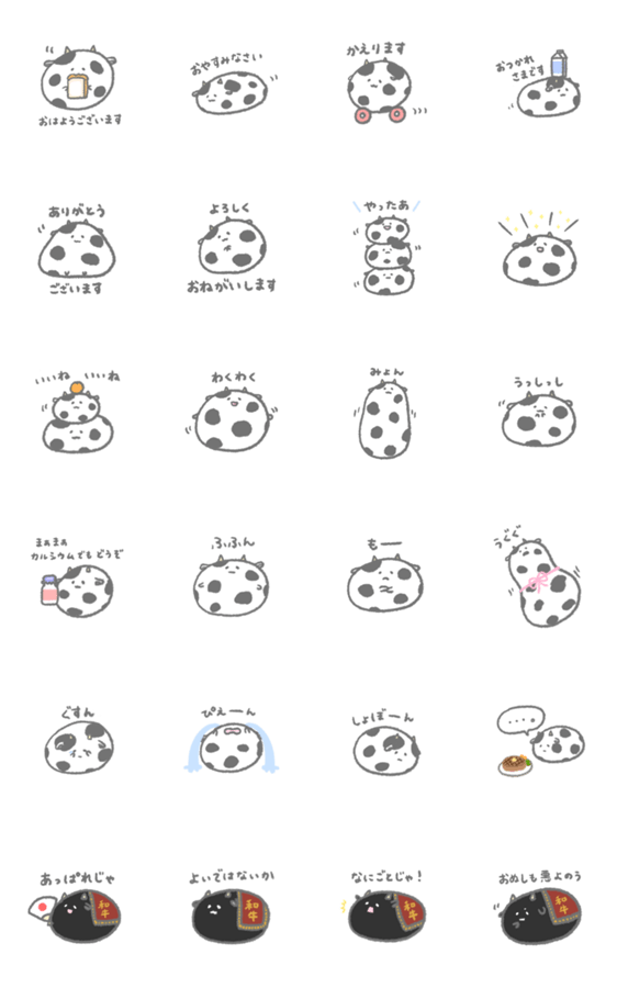 おもちのように伸びる牛のスタンプです。ゆるゆるもちもちで触り心地抜群。たまに黒毛和牛もいます。