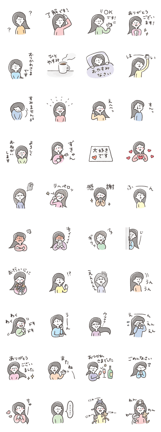 女の子 手描き スタンプ 色合い 優しい ロング さん 黒髪