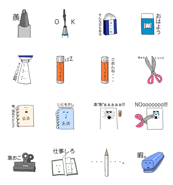 悲しげな表情の文房具達が代弁してくれるスタンプです。