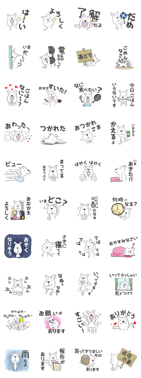 親子、夫婦、恋人同士など身近な人との会話用の白い犬のスタンプです。白ワンコは毎日元気!