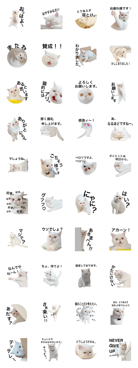 エキゾチックな白猫の、日常使えるおもしろ可愛いスタンプです。