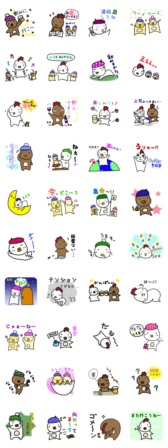 飲み会や遊びのお誘いに最適です。面白くてゆるいニワトリとヒヨコのキャラが、見てるだけで楽しくなるスタンプです。