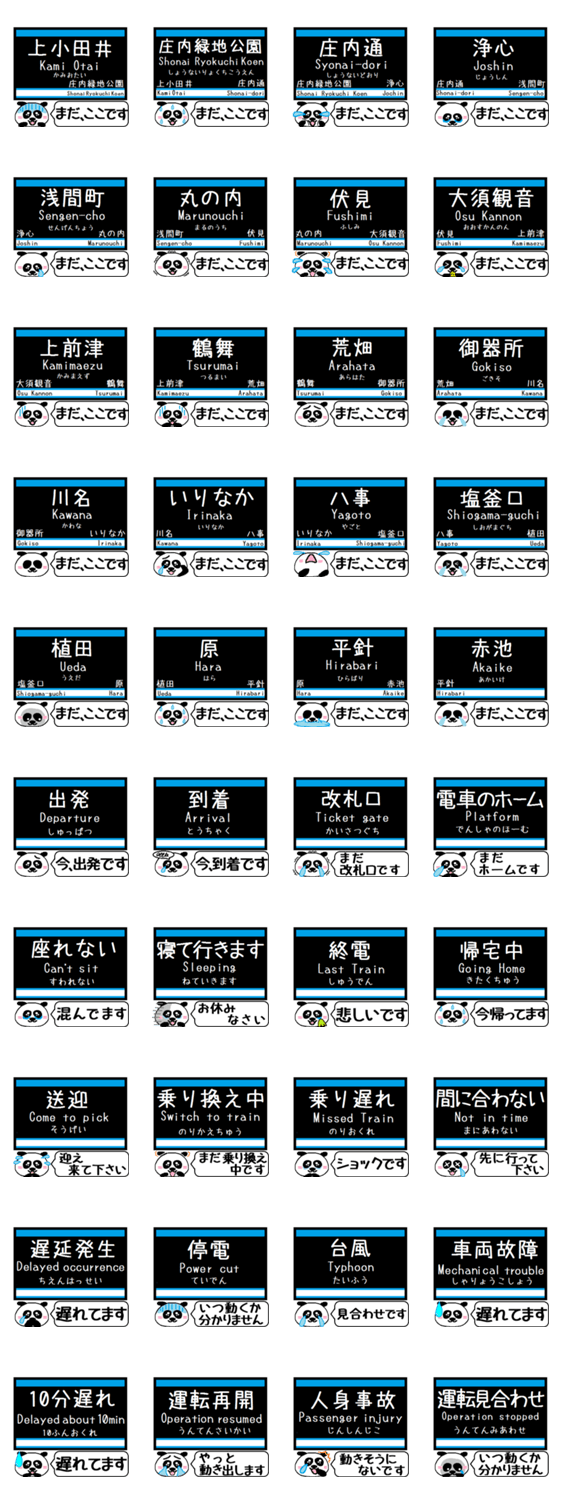 かわいいパンダが名古屋の地下鉄 鶴舞線(上小田井,庄内通,浄心,浅間町,丸の内,伏見,大須観音,鶴舞,荒畑,御器所,川名,いりなか,八事,塩釜口,植田,原,平針,赤池)駅名を連絡