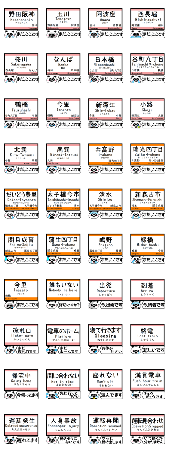 かわいいパンダが大阪地下鉄 千日前線(野田阪神,玉川,阿波座,西長堀,桜川,なんば,日本橋,谷町,鶴橋,今里,北巽,)今里筋線(瑞光,新森古市,蒲生,鴫野,緑橋,今里)駅名をご連絡