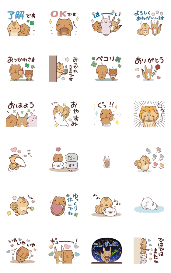 リス・フェネック・アザラシ・カピバラ・ウサギ・ネコのゆる~く動く毎日使えてほっこりできるスタンプです。大き目の文字で見やすい基本セットです♪