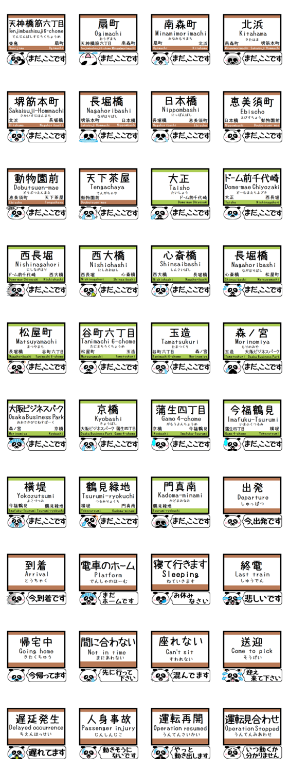 かわいいパンダが大阪地下鉄 堺筋線(天六,扇町,南森町,北浜,堺筋本町,長堀橋,日本橋,天下茶屋)長堀・鶴見緑地線(大正,心斎橋,長堀橋,玉造,京橋,蒲生,門真南)駅名をご連絡