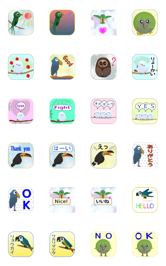 人気の鳥を使った動く鳥のラインスタンプ。カワセミ、カカポ、ハシビロコウ、シマエナガ、オニオオハシ、ルリコンゴウインコ、ケツアールなど。