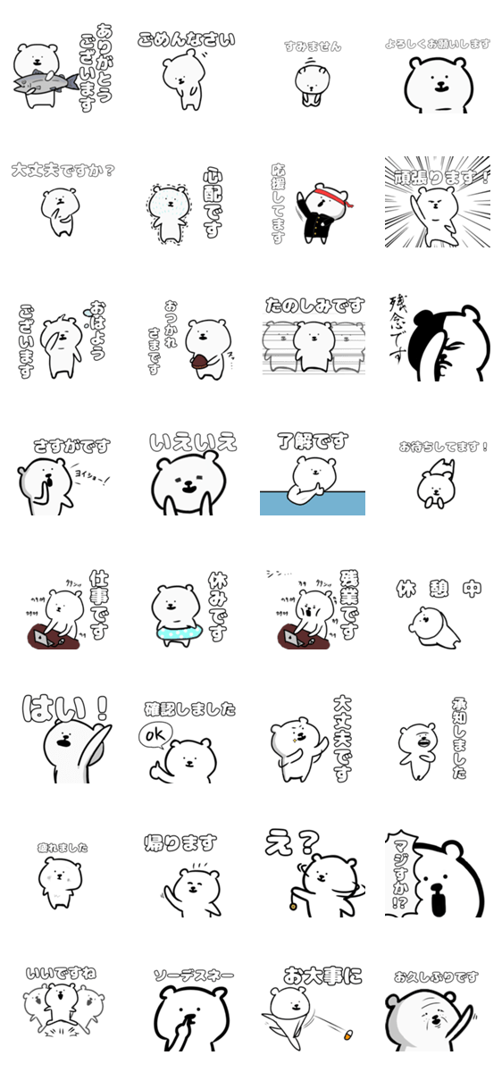 しろいくまの敬語編のスタンプです。 優しい上司や先輩に使ってください。 厳格な方に送ると多分怒られます。送る際は自己責任でお願いします。