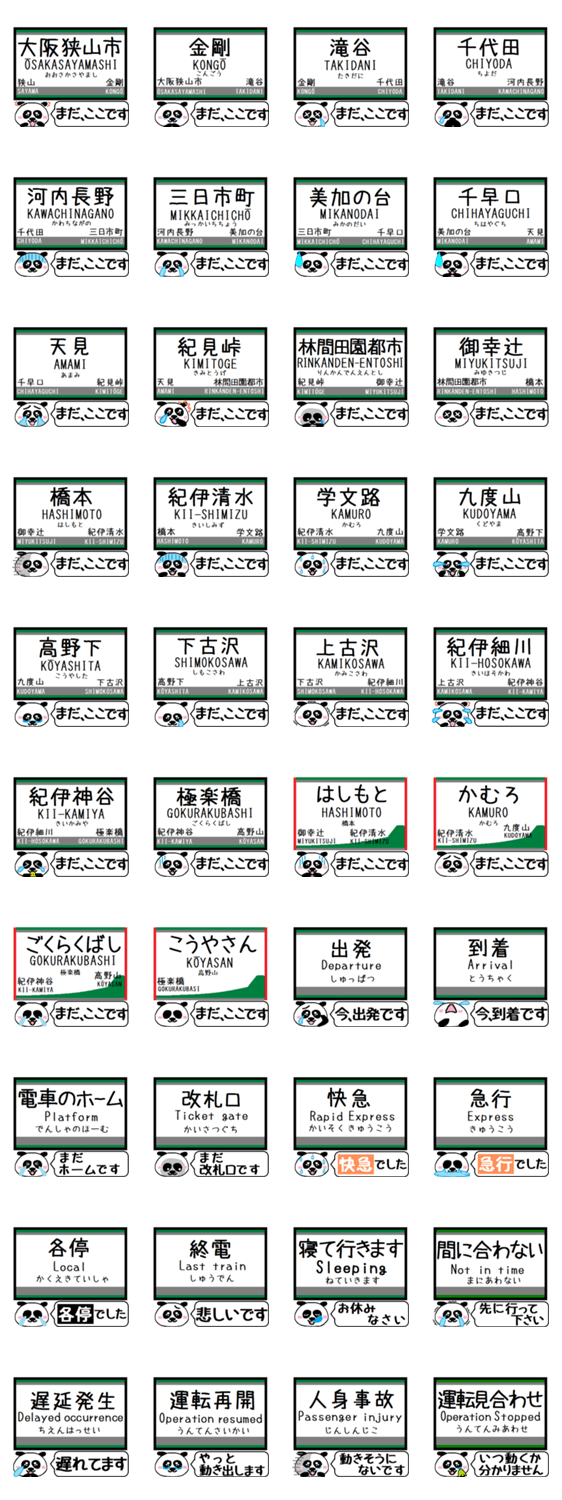 かわいいパンダが高野線(大阪狭山市,金剛,滝谷,千代田,河内長野,三日市町,美加の台,千早口,天見,御幸辻,橋本,学文路,九度山,下古沢,極楽橋,高野山)高野ケーブル駅名を連絡