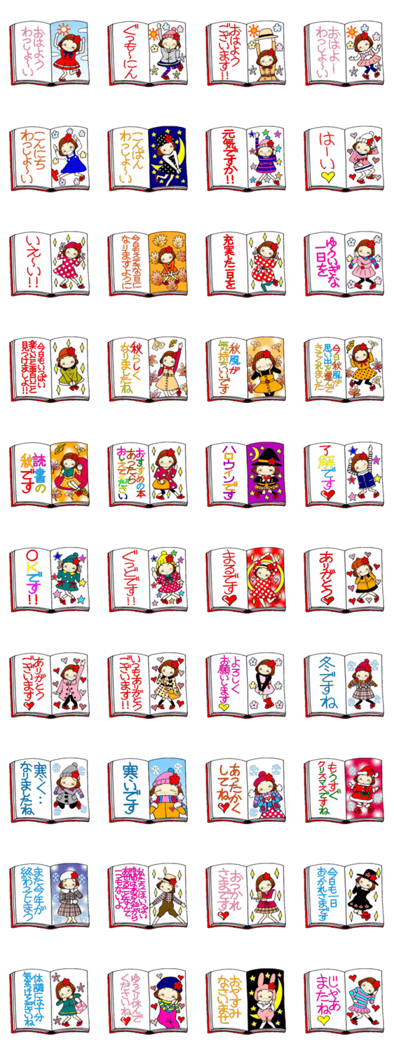 いつも暇をもてあましてるひま子ちゃんの今回は本の中から挨拶をしている秋冬スタンプです。よろしくお願いします!