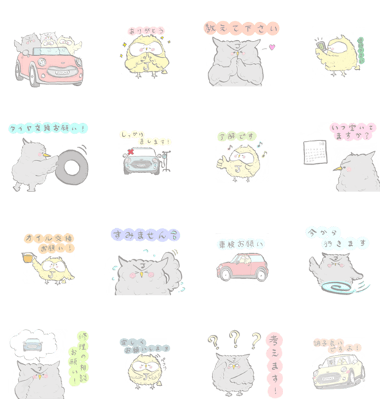 ゆるく可愛くふくろうでコミュニケーション ふくろう好きや車好きに幅広く使えるスタンプです。