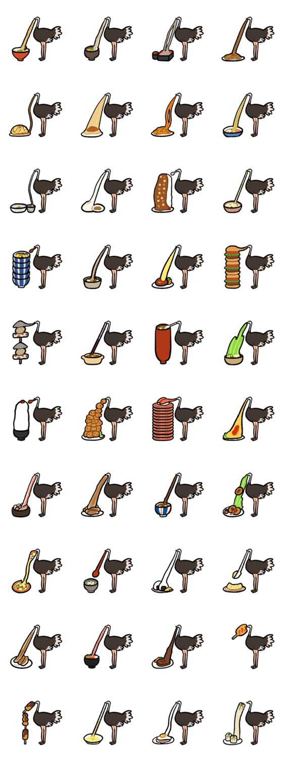 高いところから麺をすするダチョウのスタンプです。 麺以外も食べます。