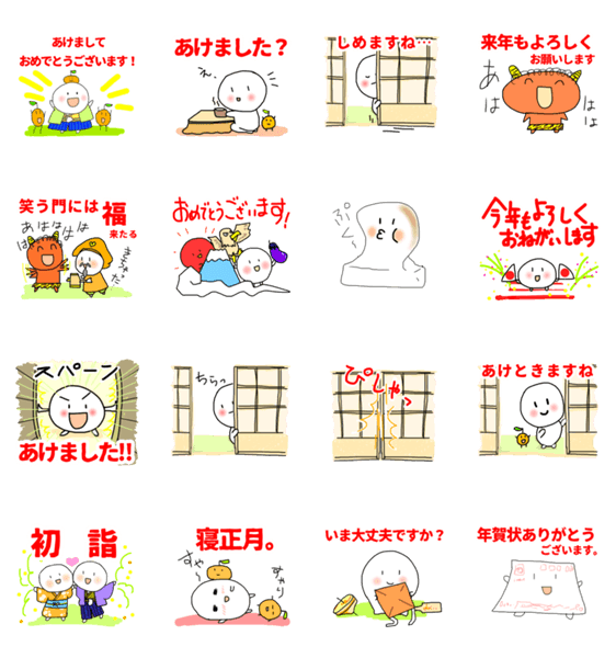 年末年始お正月から節分の豆まきまで。あいさつに使えるゆるいスタンプです。たのしいスタンプなのでスタンプで4コママンガを作って遊んだりもできます。鬼もかわいいよ。