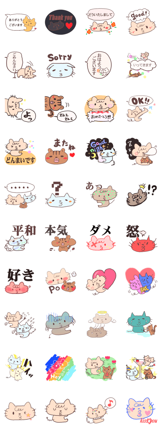 ゆるかわいいようで、ちゅちゅっと刺激的にユニークな猫スタンプ。でも あいさつふきだしなどで、日常的に使いやすい感じ。