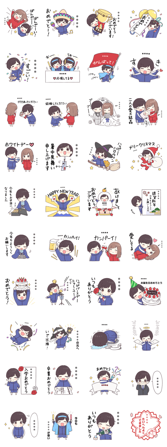 お正月、ハロウィン、クリスマス、バレンタイン、ホワイトデー、父の日・母の日、暑中見舞い、お誕生日、ライブ等。年間通して使える豪華セットです。(7文字まで対応)