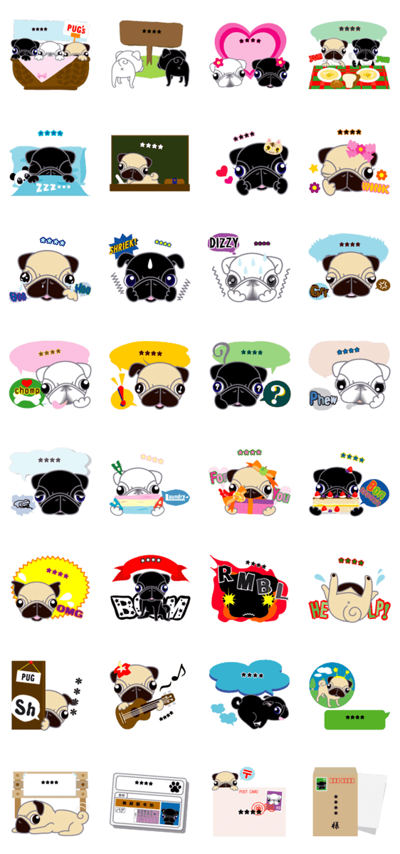 PUGGY POPのパグ犬スタンプ№9 カスタム 白パグ増えました! パグに言わせたい、言ってもらいたい言葉6文字まで