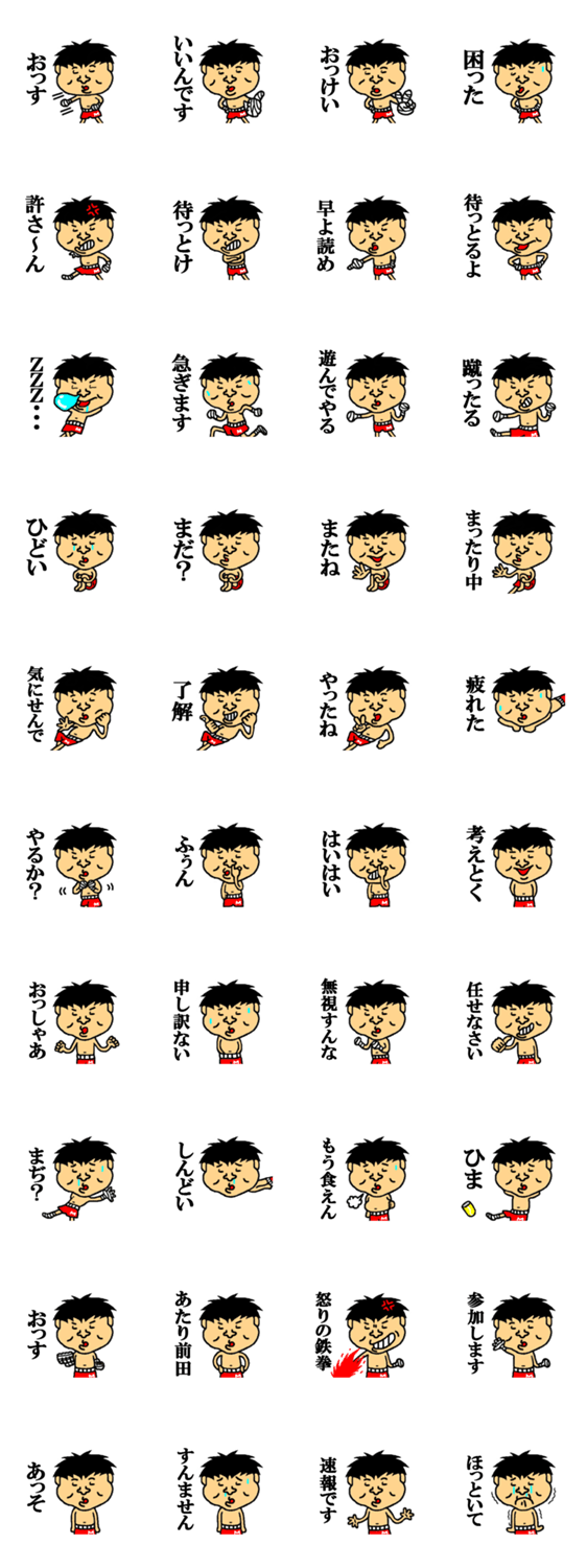 格闘家を目指す架空のキャラ前田による日常会話に使えるワードを集めたスタンプです。