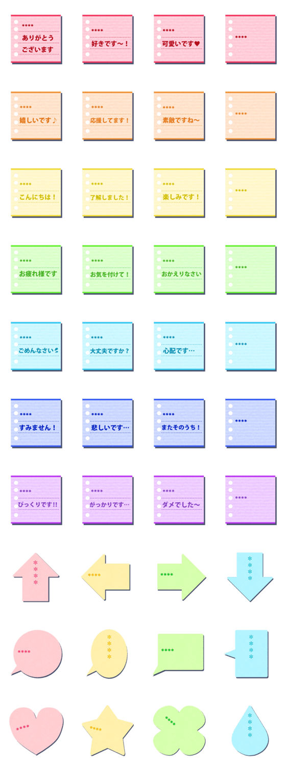 | スタンプ説明 | カラフルなルーズリーフと付箋のシンプルなカスタムスタンプです。 最大文字数は6文字です。好きな言葉を入れて使ってね♪ |