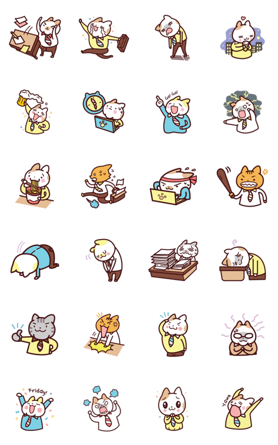 | スタンプ説明 | Here comes the wacky cats from a dysfunctional office! Enjoy your chat with your peers and colleagues using these outrageous feline employees! |