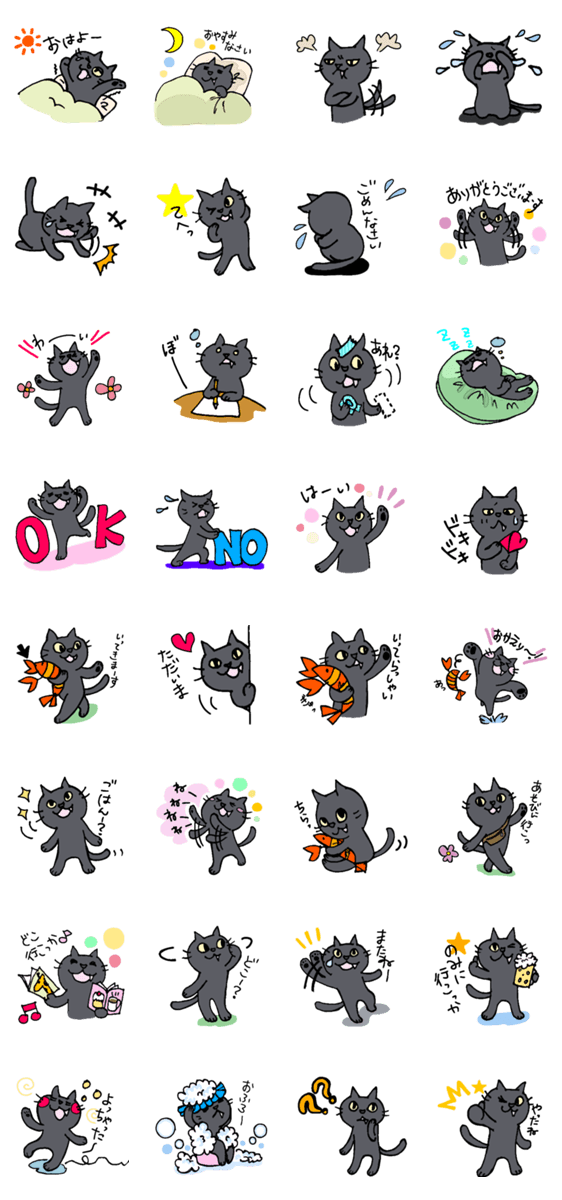 ちら見えのキバがトレードマーク。 甘えん坊なくろねこジジのスタンプです。