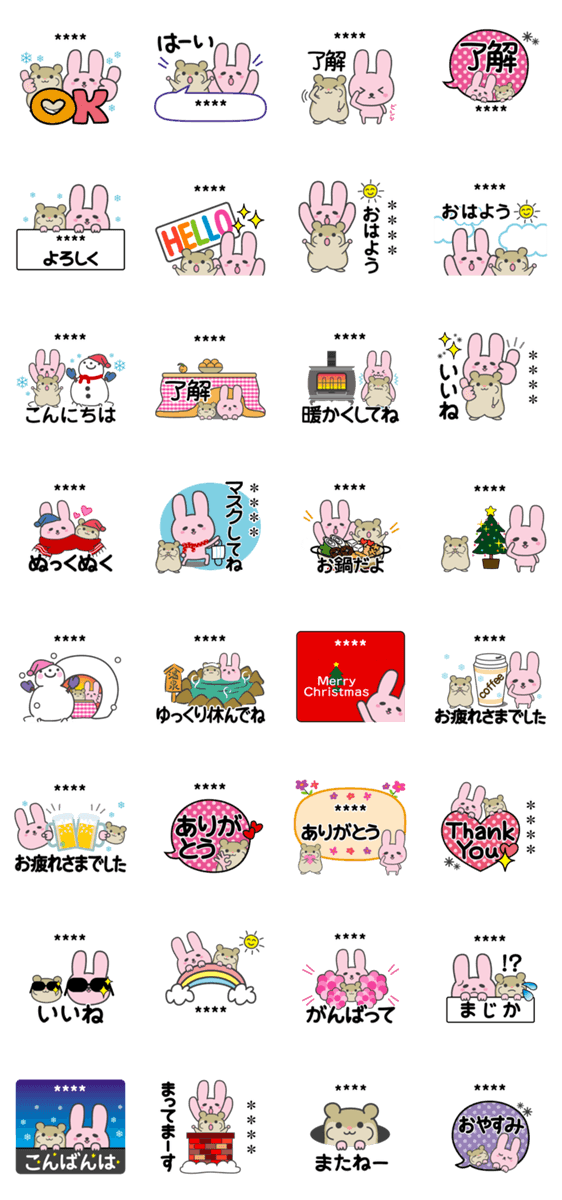 | スタンプ説明 | うさぎとハムスターの冬に使える日常スタンプ♪ お名前など、好きなテキストを入れることができるスタンプです。何度でもテキストを入れ替えることができます。KEN graphic |