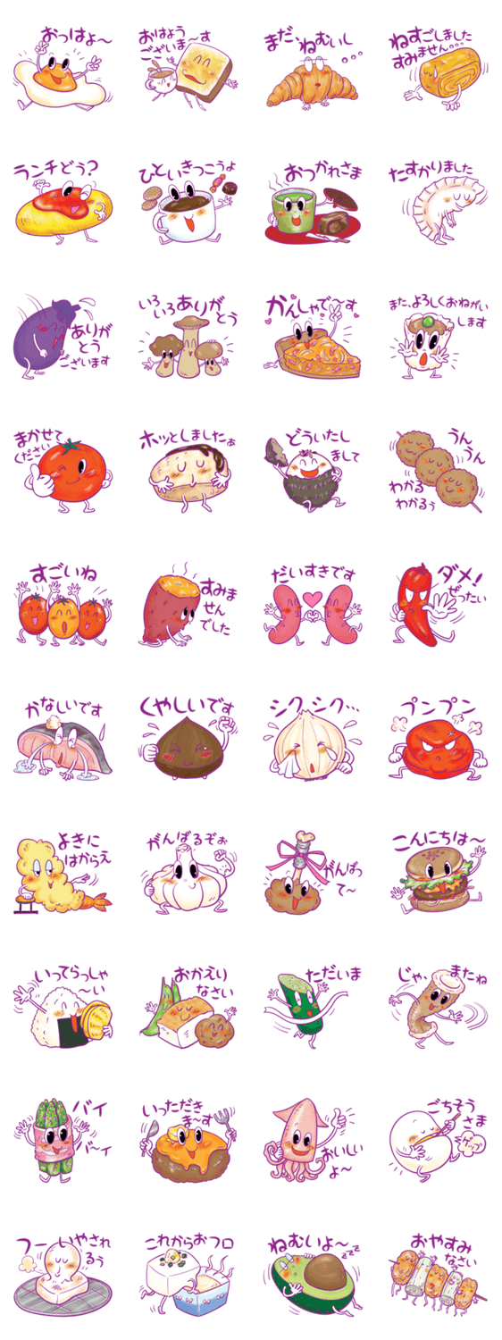 | スタンプ説明 | 大人も使いやすい、食べ物キャラクターのユニークで楽しいスタンプです。 |