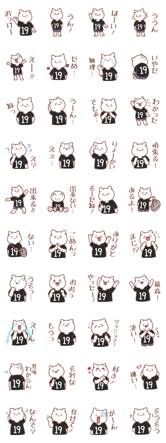 19番の黒いユニフォームをきた猫のスタンプです!野球・サッカー・バスケ・バレー・ハンド・アメフト・ラグベー等の背番号、出席番号などお好きな数字をどうぞ!