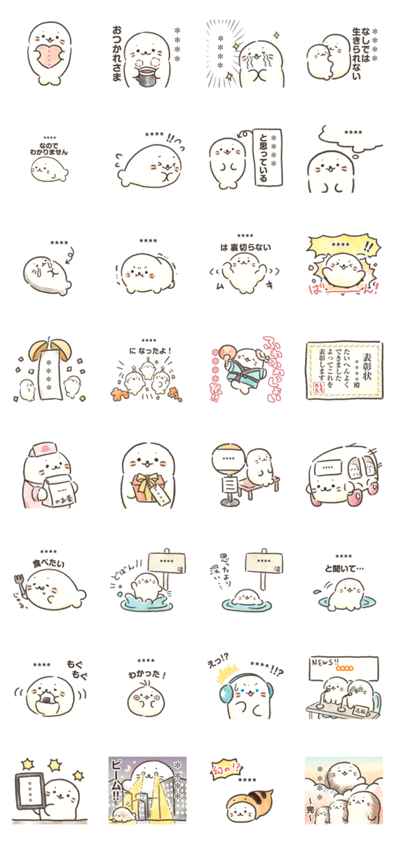 | スタンプ説明 | かわいいたてごとアザラシの“しろたん”のカスタムスタンプが登場! ****に名前や好きな言葉を入れて楽しく使ってね♪ 文字は何回でも変更出来るよ! |
