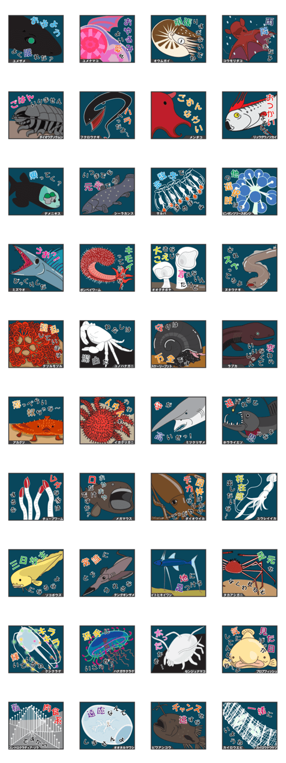 変な深海魚、深海生物が図鑑的スタンプになりました。不思議な世界を楽しんでください。