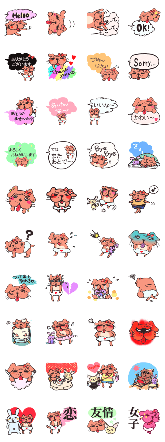 おしゃれが好きなブルドッグの女の子 “ブル美“(ブルミ) の、かわいい犬スタンプ。親友はチワワの “チワンヌ” 、彼氏はうさぎのウサ田です。